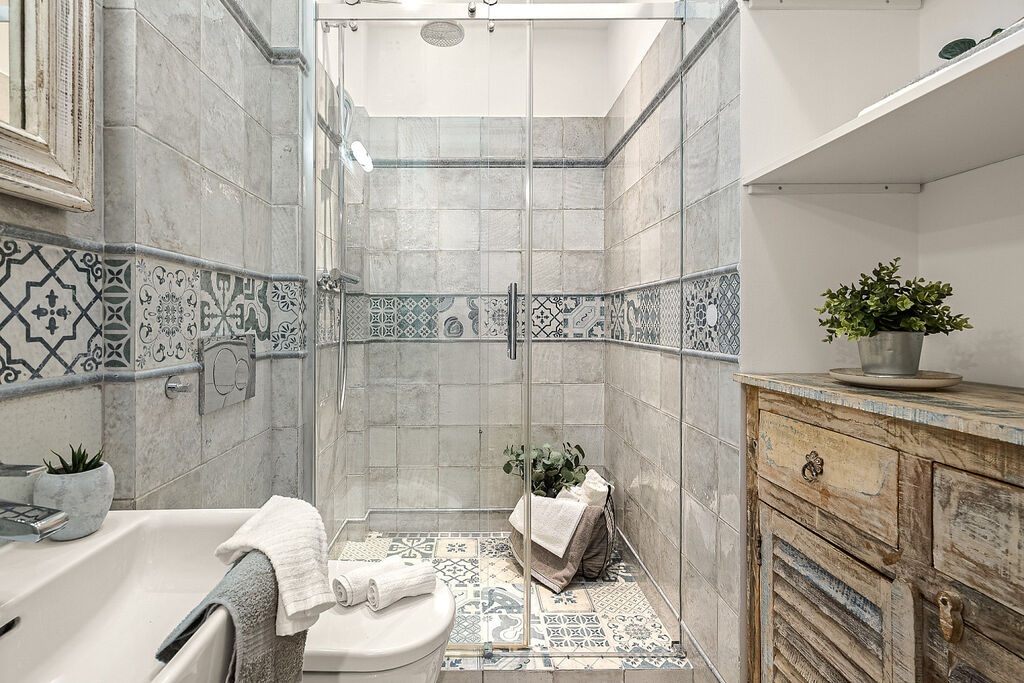Na kuchyni navazuje obývací pokoj a útulná ložnice. Koupelna se sprchovým koutem působí jako malé boutique spa – kombinace kvalitních materiálů a promyšleného provedení dodává prostoru klid a eleganci.