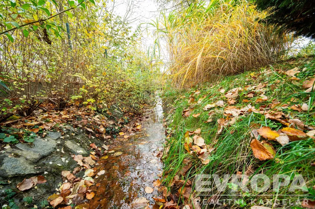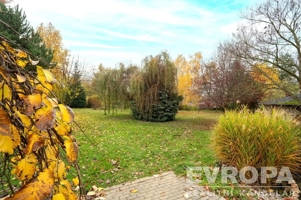Rozloha pozemku je 3 665 m², z toho zastavěná plocha 334 m². Prostorná okrasná zahrada je oddělena uzavřenou automatickou bránou. Menší část prostranství je situována před budovou, oddělena od komunikace automatickou závorou, a je ideální jako parkování pro zákazníky a pro venkovní posezení (restaurace, cukrárna), čímž je zajištěna komerční viditelnost. Mnoho desetiletí udržovaná okrasná zahrada s potůčkem přidává nemovitosti půvab, soukromí a poskytuje odpočinkové zázemí, dominují zde vzrostlé okrasné dřeviny (nádherný platan, břízy, jehličnany), skrývá také unikátní prvek protéká jí potůček vytvářející uklidňující atmosféru, k relaxaci a setkávání slouží útulný zahradní altán. Balkóny umožňují obyvatelům vychutnávat si klidné okamžiky s panoramatickými výhledy do vlastní zahrady a na údolí řeky Berounky, obzory Chráněné krajinné oblasti Český kras.
