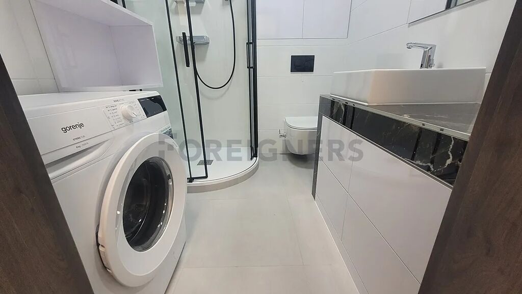 V koupelně se nachází sprchový kout, toaleta, umyvadlo, skříňka a pračka!