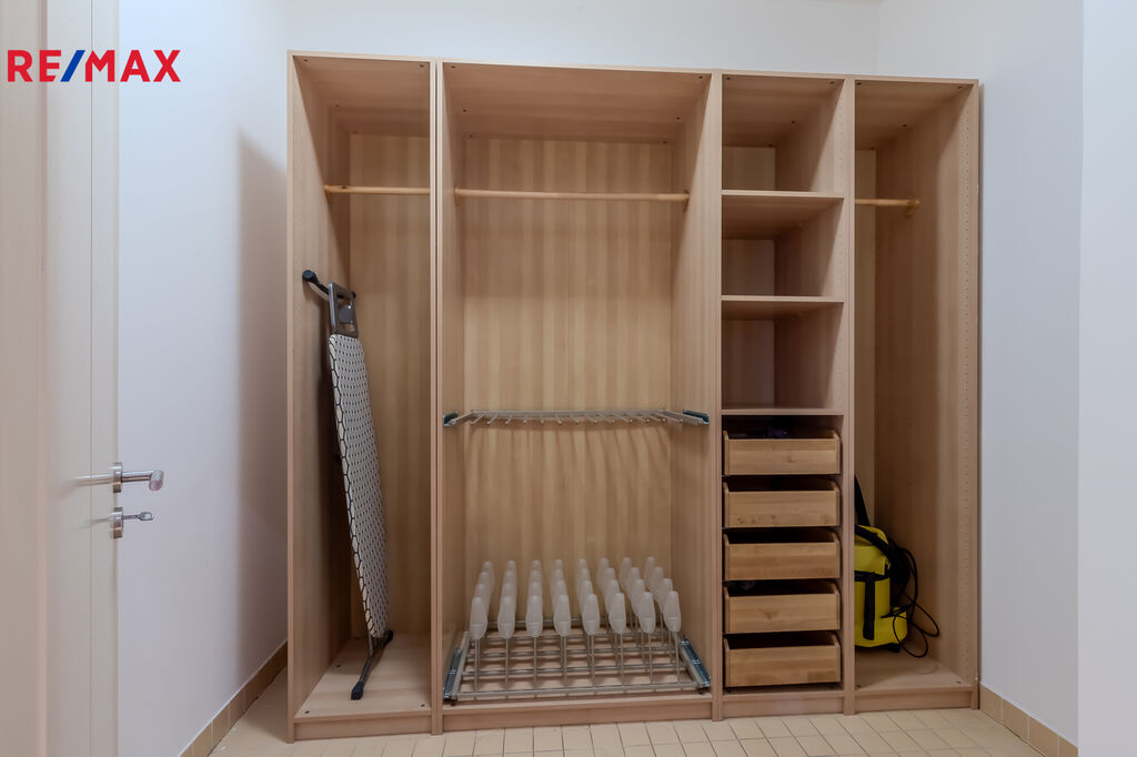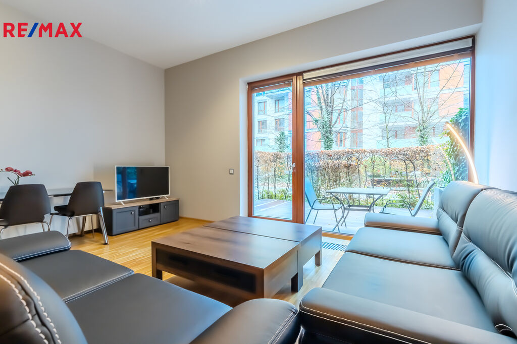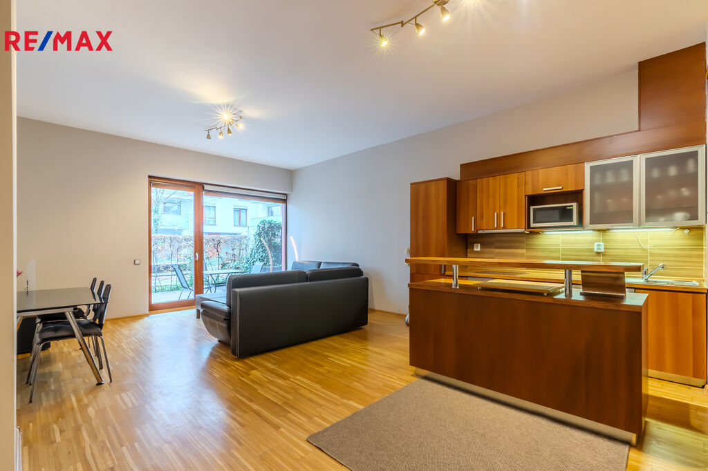moderní kuchyňská linka se spotřebiči (indukce, trouba, mikrovlnná trouba, myčka, lednice s mrazákem), sušička, pračka. V bytě jsou dvě pohovky, konferenční stolek a další nábytek, který je součástí bytu, ale po dohodě může být odstraněn dle preferencí nájemníka.