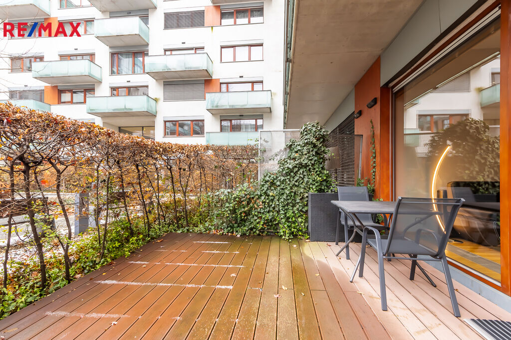 Byt je orientovaný do klidného vnitrobloku s japonskou zahradou, což zajišťuje naprosté soukromí a příjemnou atmosféru uprostřed dynamicky se rozvíjejícího Karlína.