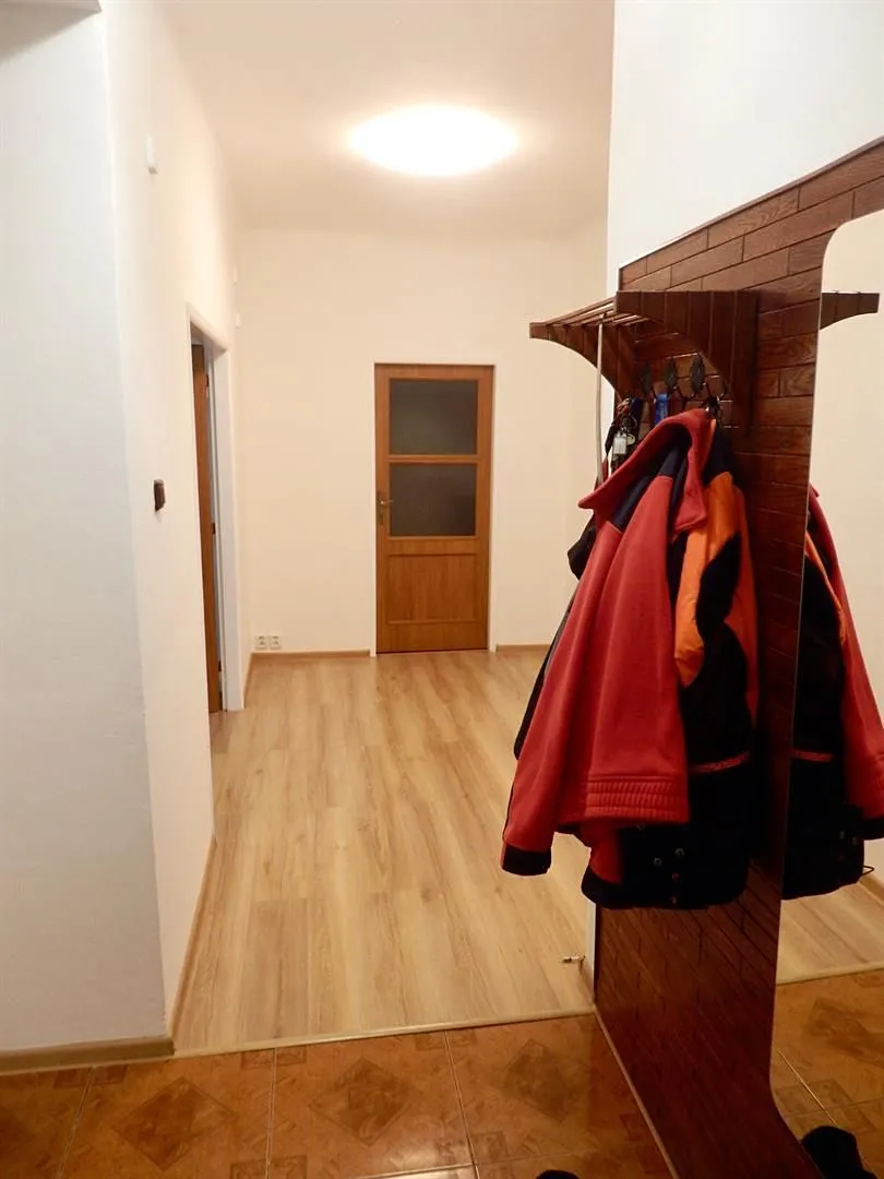 Vstupem do bytu se ocitnete v chodbičce propojené s halou o ploše 10,5 m2, z které se hned po levé straně od vstupu dostanete do kuchyně o ploše 3,14 x 2,63 m ( 8,3 m2 ) s kuchyňským koutem, plynovým sporákem, digestoří, mikrovlnkou, varnou konvicí, dřezem, novou lednicí s mrazákem a novou myčkou nádobí. Z kuchyně je ještě vstup do menší komory. Před kuchyní je umístěna koupelna o ploše 1,8 x 1,6 m ( 2,9 m2 ) s vanou, umývadlem se zrcadlem a pračkou. Hned vedle koupelny se nachází samostatná toaleta. Z předsíně je po levé straně vstup do jednoho z pokojů a zároveň do malé chodbičky, která je oddělena od haly dveřmi. Z chodbičky je následně po levé straně vstup do pokoje, který je předmětem této nabídky. Pokoj o ploše 10,4 m2 ( 2,2 x 4,8 m ) se nabízí bez vybavení, s možností odkoupení skříně, na podlaze je položen koberec. Hned naproti je umístěn třetí z pokojů. V chodbičce, z které je vstup do obou pokojů, se nachází prostorná skříň, na podlaze je plovoucí laminátová podlaha.