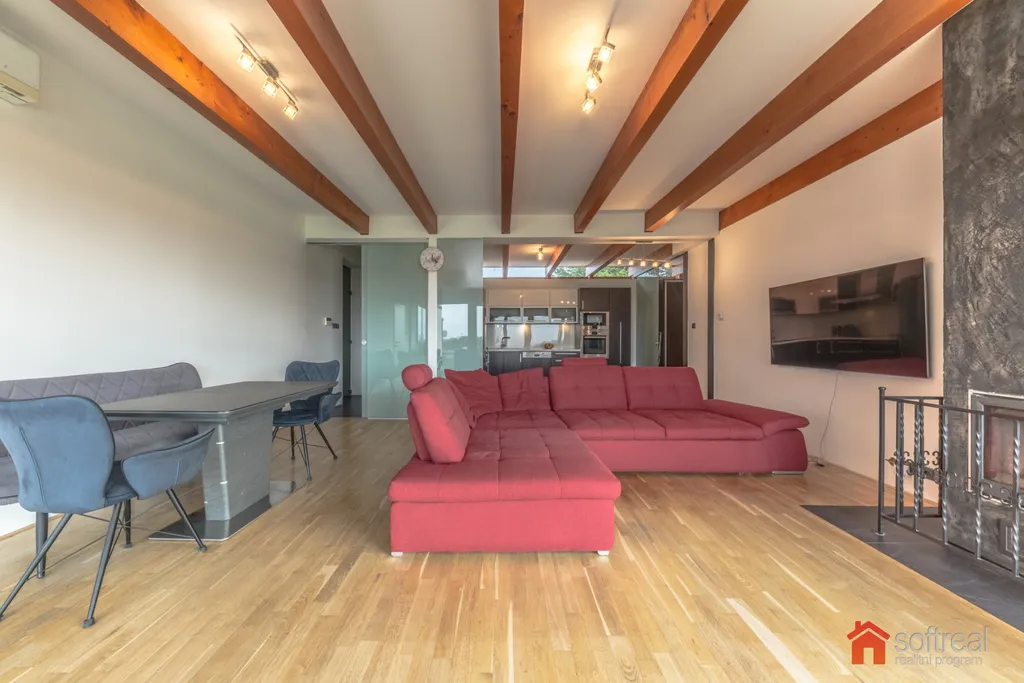 - velký obytný prostor s kvalitní kuchyňskou linkou, prosklenou stěnou a vstupem na terasu,