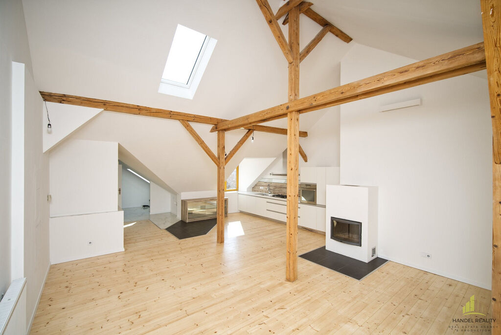 Schodiště vás zavede do podkrovního pokoje, kde se nachází menší relaxační prostor nebo pracovní koutek – ideální pro ty, kteří potřebují klidné místo pro práci nebo odpočinek. Původní krov bytu přidává na charakteru a jedinečnosti prostoru. V přízemí se nachází prostorná ložnice a moderně zařízená koupelna, která splní veškeré vaše požadavky na komfort.