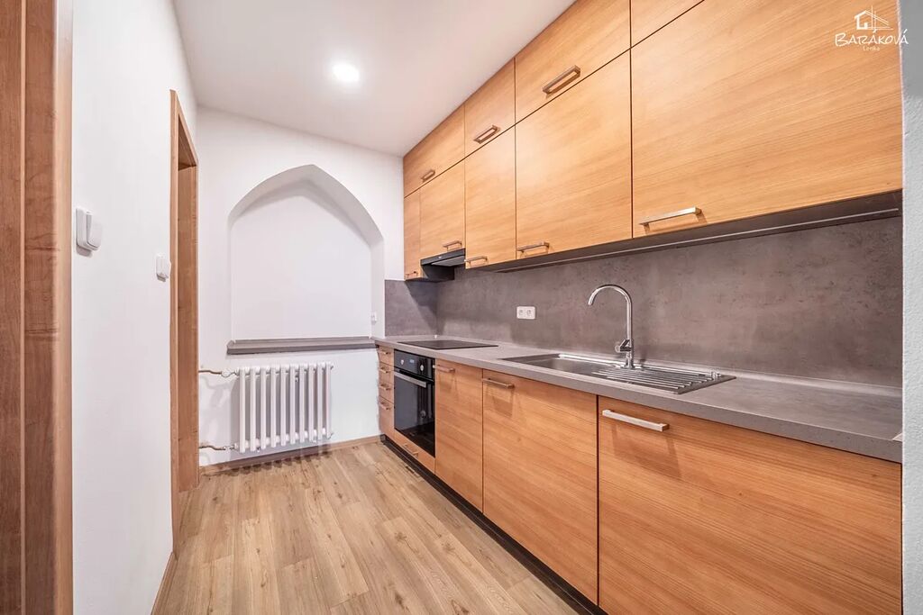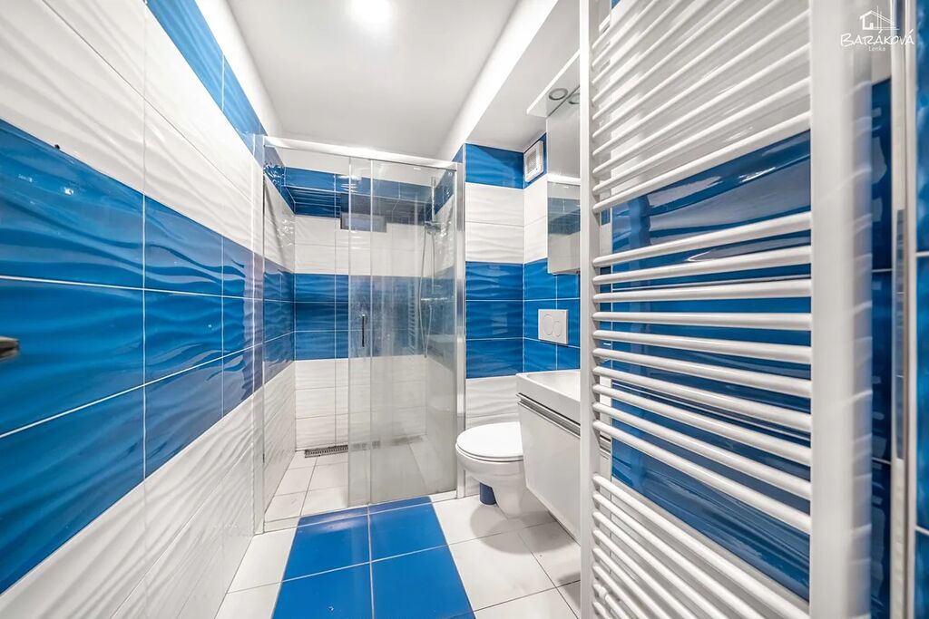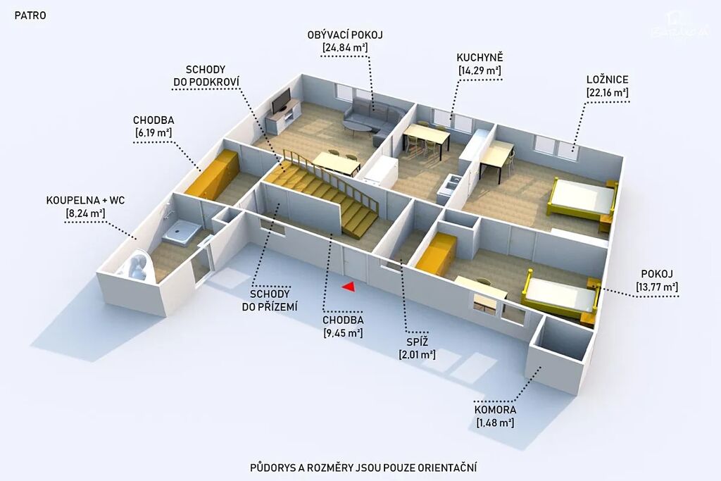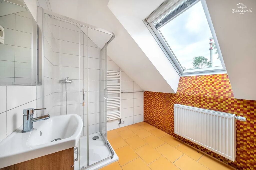 V prvním patře je prostorný byt 5+1 s kuchyní na míru, koupelnou s vanou, samostatnou toaletou a vestavnými skříněmi v ložnici.