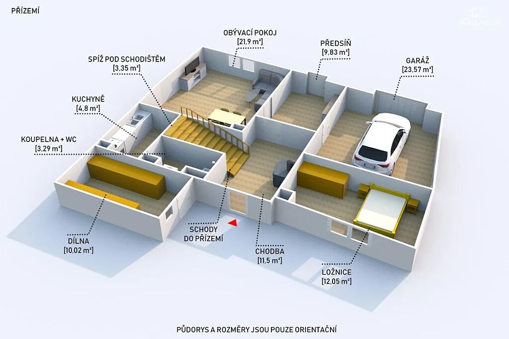 V přízemí se nachází garsoniéra s kuchyní na míru a koupelnou se sprchovým koutem.