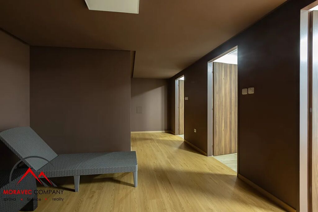 Součástí domu je navíc fitness místnost, wellness a také venkovní krytý bazén.