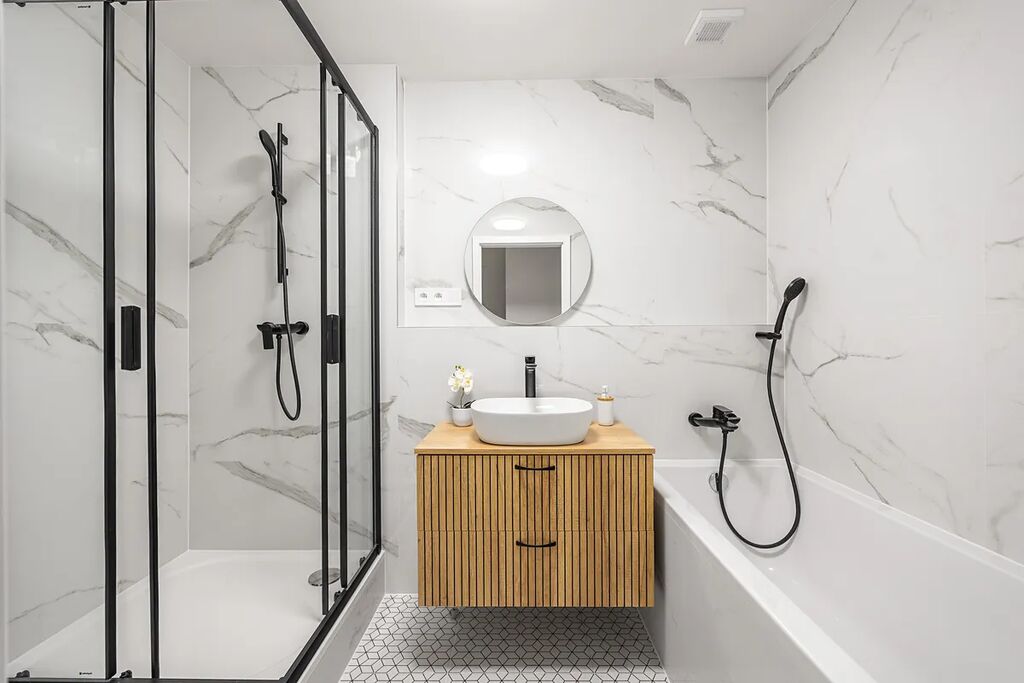 - nová sanita (vana, sprcha, umyvadlo, skříňka, toaleta)