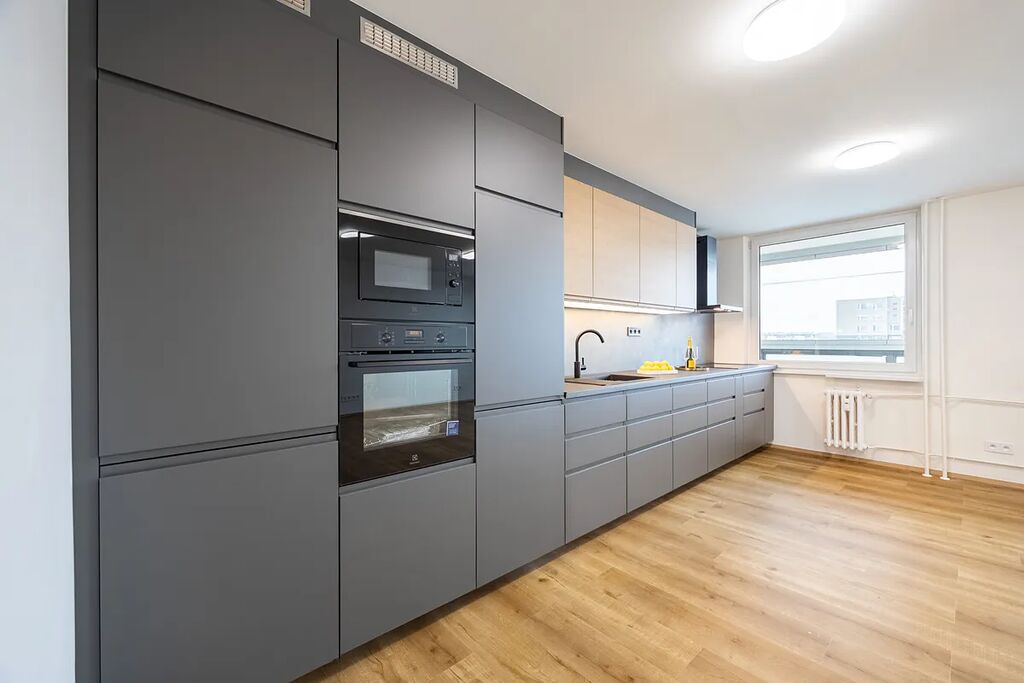 Byt vypadá přesně jak vidíte na fotografiích, nejedná se o vizualizaci. Kuchyně je navržena pro pohodový a rodinný život s dostatkem úložných prostor a je kompletně vybavená spotřebiči (elektrická trouba, myčka, mikrovlnná trouba, indukční deska) a spolu s obývacím pokojem má 31 m2. Koupelna je s vanou, se sprchovým koutem a podlahovým topením, elegantním žebříkem a designovým umyvadlem na skříňce. Dále je zde nová vestavná skříň na míru a prostorný sklep.