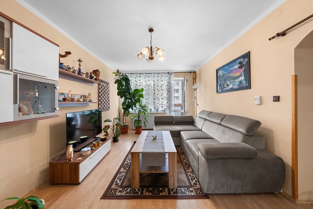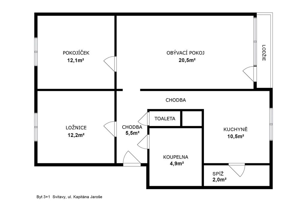 Obývací pokoj (20,5m2), pokojíček (12,1m2), ložnice (12,2m2), kuchyně (10,5m2), spíž (2,0 m2), koupelna s komorou (4,9m2), předsíň (5,5m2) a samostatné WC (1,0m2). Byt má lodžii (cca 2,4m2) a sklep (cca 6,8m2).