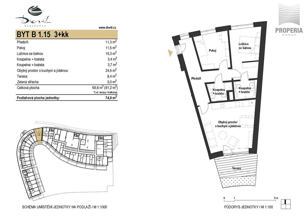 Dovolujeme si Vám nabídnout v tomto nízkoenergetickém bytovém domě ke koupi bytovou jednotku 3+kk, s terasou 8,4 m2 + zelená střecha 3 m2. Bytová jednotka je označena č. B 2.15 a nachází v 1. NP o velikosti 74,8 m2. Cena je uvedena včetně parkovacího stání, skladové kóje 9,4 m2 a další kóje je na patře.