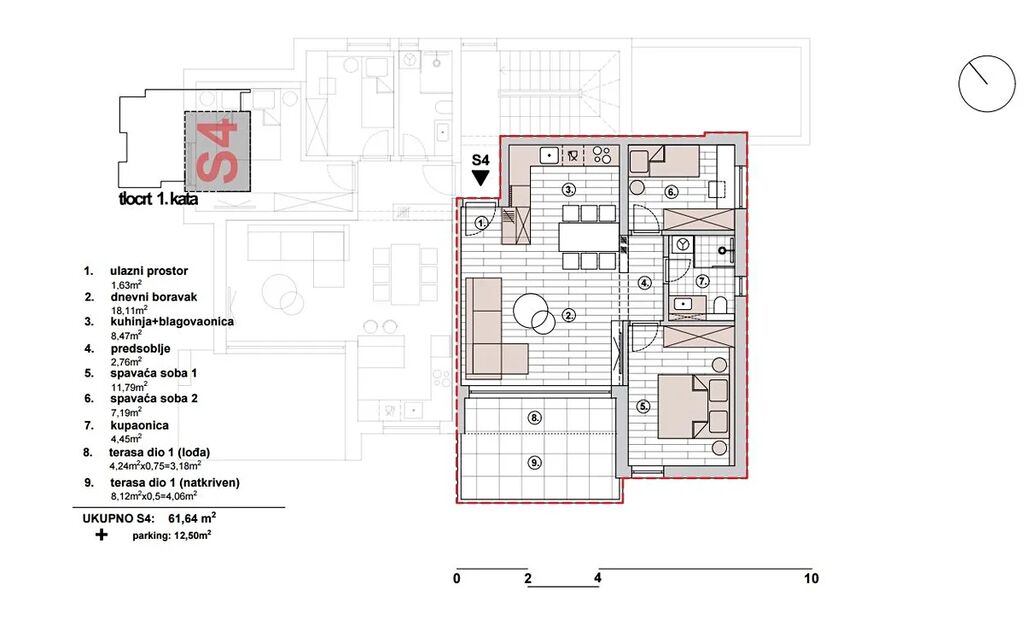 Moderní apartmán S4 o ploše 66,64 m2 se nachází ve 2. podlaží novostavby, která se staví dle nejvyšších standardů moderního bydlení a jejíž dokončení je plánováno na léto 2026. Apartmán sestává ze vstupní chodby, koupelny, dvou pohodlných ložnic a obývacího pokoje s kuchyní a jídelnou s přístupem na prostornou terasu o rozloze 12,34 m2. Apartmán bude mít podlahové vytápění, vysoce kvalitní keramické podlahové krytiny, prvotřídní parkety, klimatizaci, elektrické rolety a moskytiéry. K apartmánu náleží garážové parkovací stání o rozloze 12,50 m2 s možnosti nabíjení elektrických nebo hybridních vozidel (nabíjecí stanice je již nainstalována).