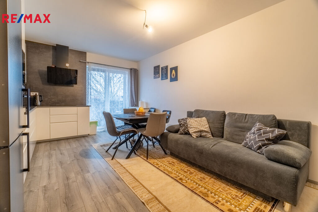 Obývací pokoj s kuchyňským koutem a vstupem na balkon; na balkon je přístup i z ložnice – ideální na ranní kávu.