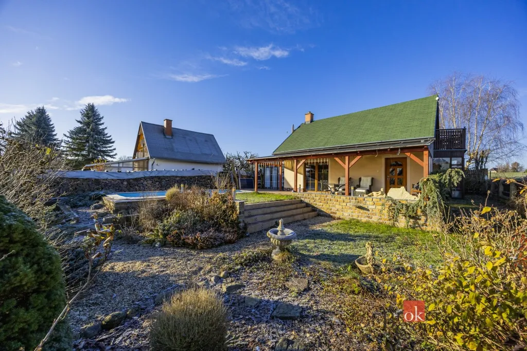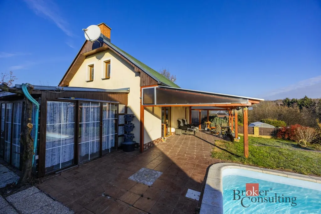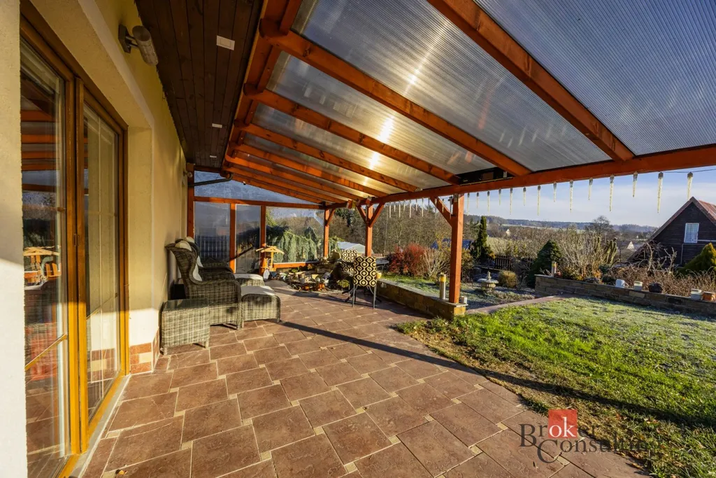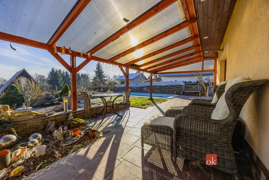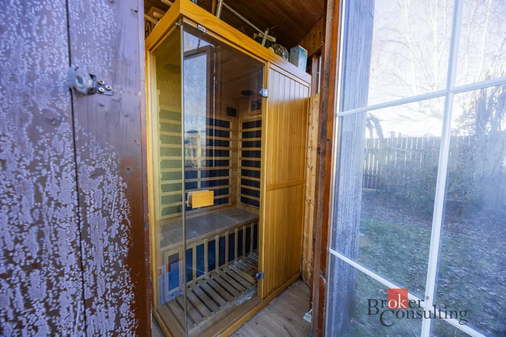 Součástí domu je již zmíněná zastřešená terasa, umožňující příjemné posezení i za horšího počasí. K domu je přistavěná také část s infrasaunou s přímým výhledem do přírody při saunování. Další místnost slouží jako zahradní veranda či párty místnost a je vybavena luxusní vířivkou. Zahrada je architektonicky navržená a členitě řešená, s dekorativními zákoutími, příjemným osvětlením i ozvučením pro večerní atmosféru. Dominantou celého venkovního prostoru je velký bazén. Nedílnou součástí je také samostatná dílna, ideální místo pro kutily, hobby práce, domácí projekty nebo bezpečné uložení nářadí.
