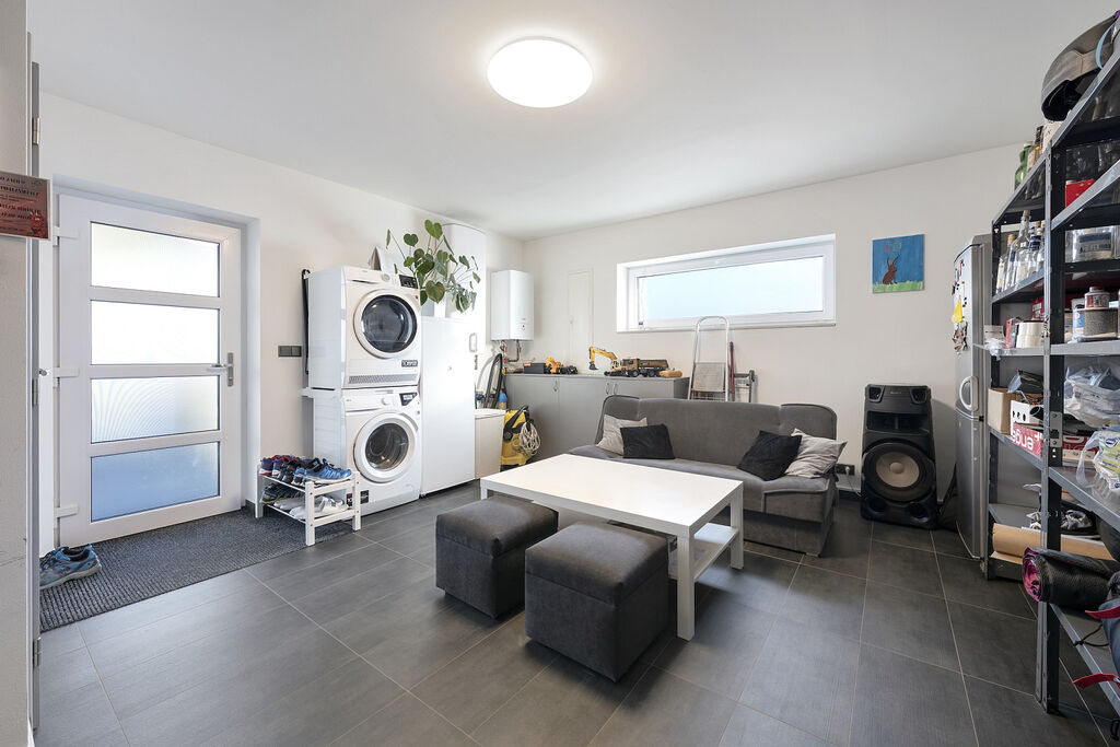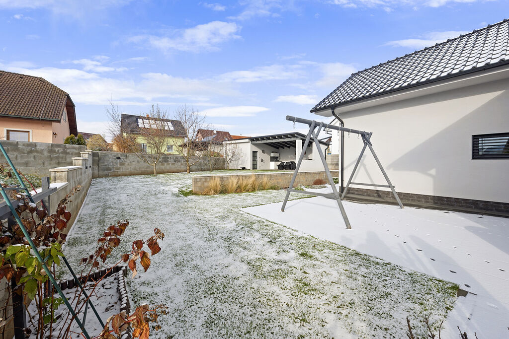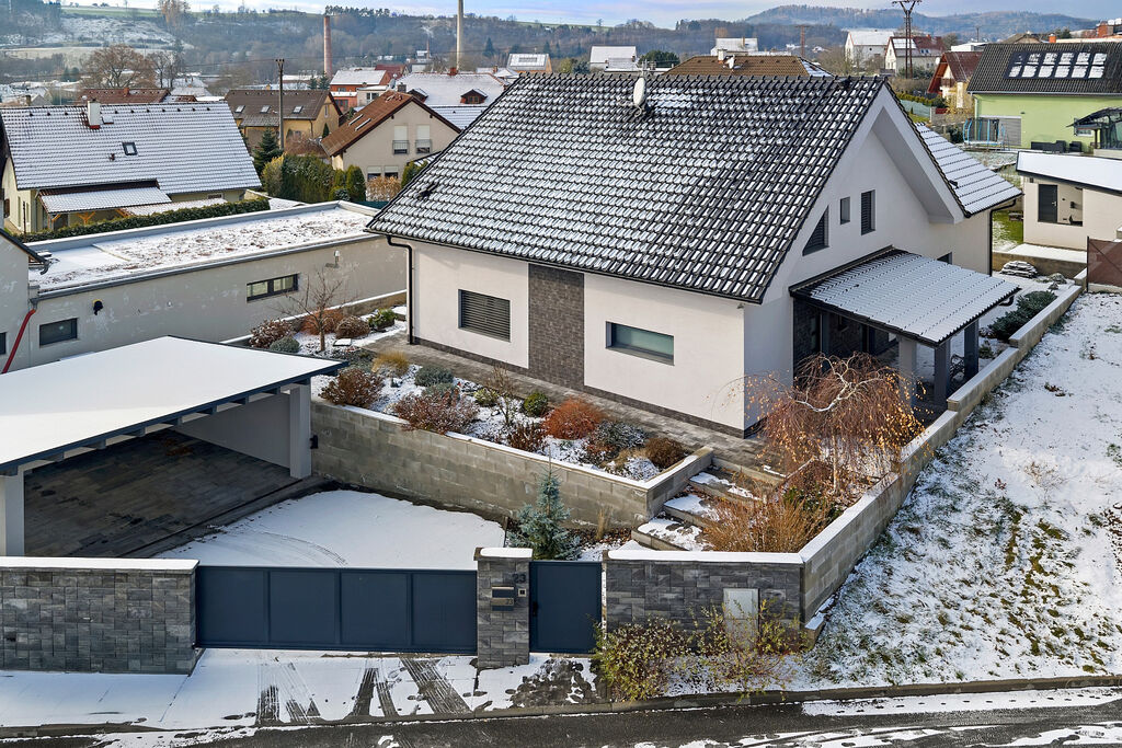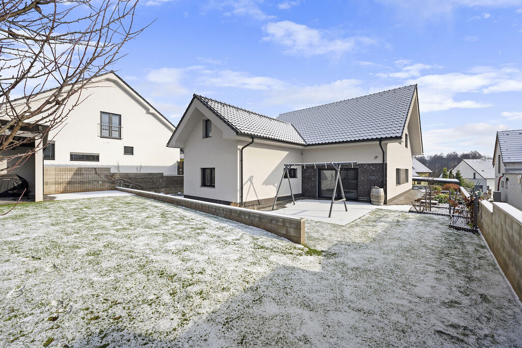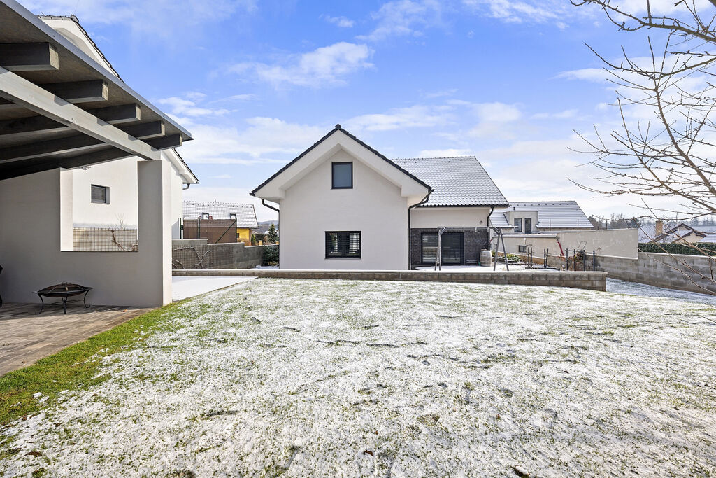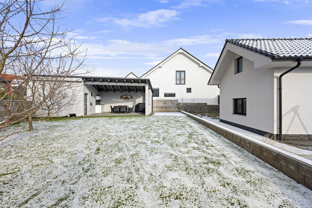 Část pozemku je koncipována jako okrasná plocha, část za domem je travnatá s ovocnými stromy. Velká terasa nabízí majitelům dostatek prostoru pro trávení volného času s rodinou a přáteli.