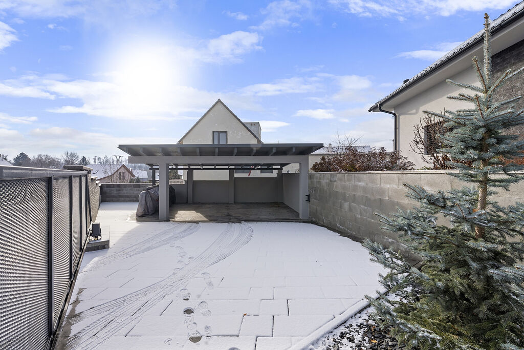 Na pozemku před domem je zbudováno vydlážděné kryté parkovací stání.