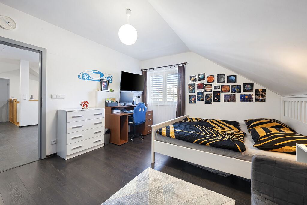 chodba, ze které je vstup do 3 samostatných pokojů, koupelna s WC a půda, která je připravená pro vybudování dalšího pokoje.