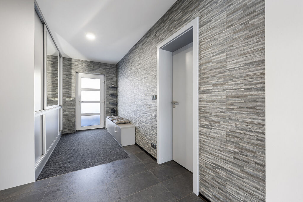 zádveří, chodba, ze které můžete vstoupit do obývacího pokoje s kuchyní, ložnice , koupelna s WC, pracovna a další WC