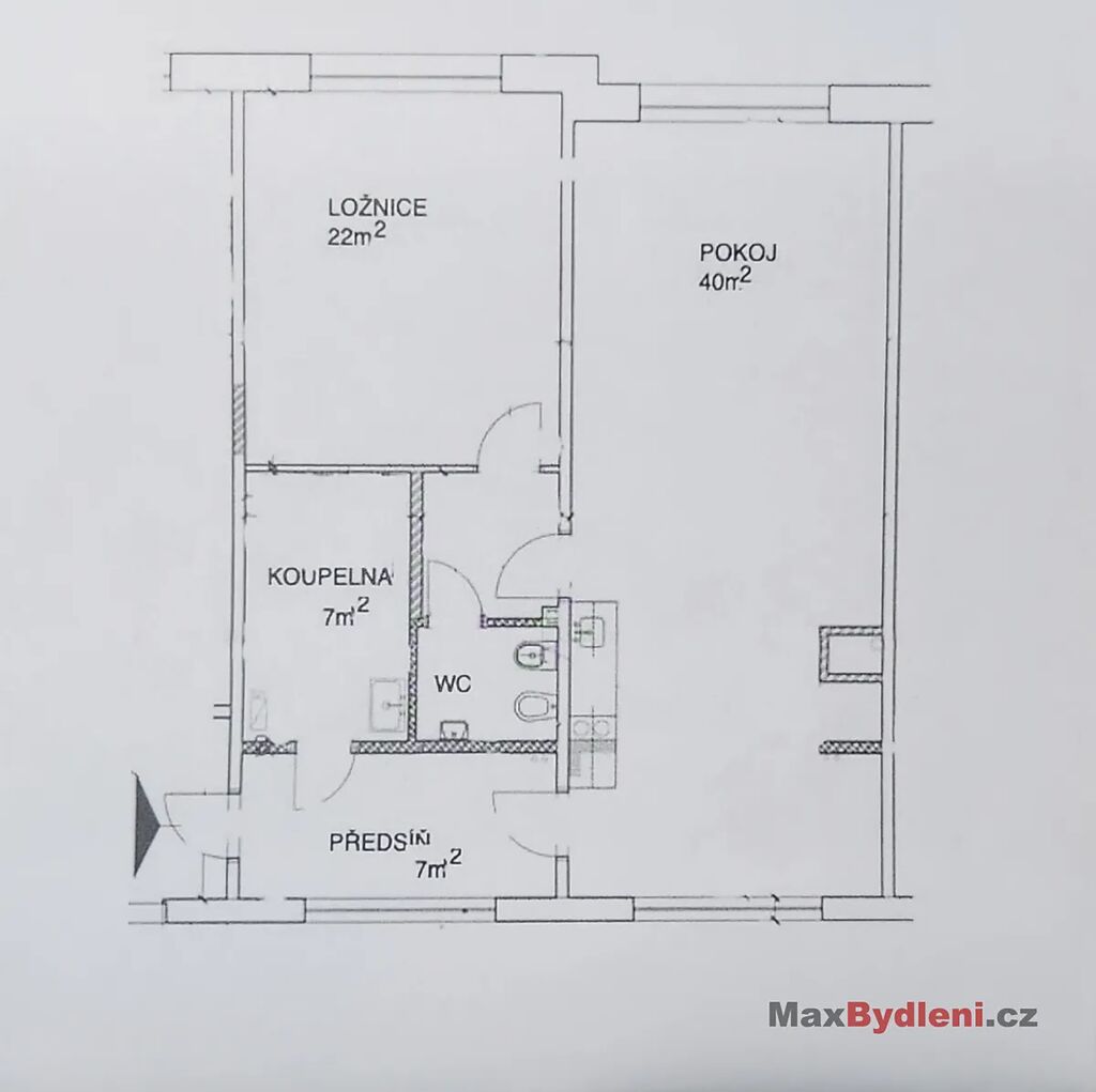 Hlavní obytná místnost o rozloze 40 m² nabízí díky své velikosti možnost jednoduchého rozdělení na dva plnohodnotné pokoje. Okna obývacího pokoje i ložnice jsou orientována na jih, což zajišťuje dostatek denního světla.