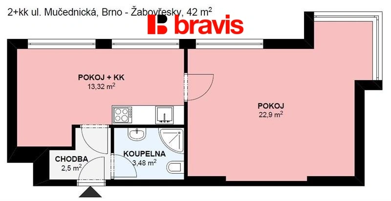 Byt obsahuje předsíň, obytný prostor s kuchyňským koutem, ložnici a koupelnu.