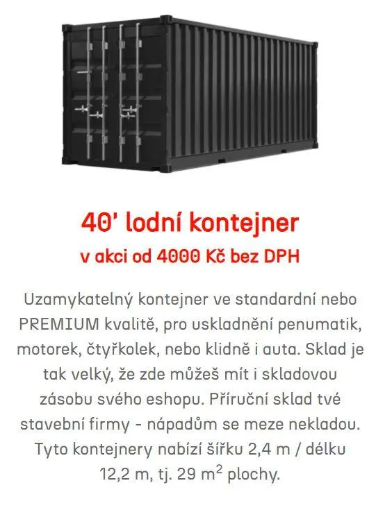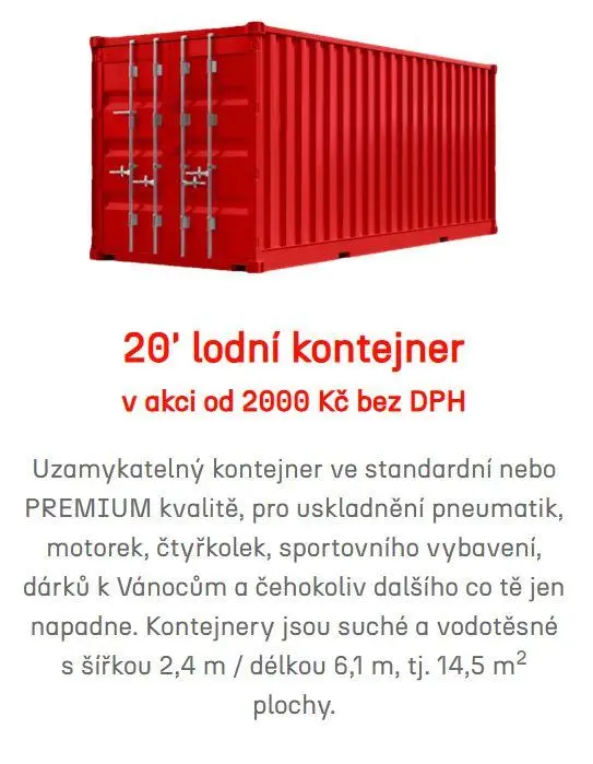 Pronajmeme prostory na skladování, o výměře 14 m2 ( Kontejner 20´), manipulační plocha. Po dohodě možno kontejnery 40´ cca 29 m2 ( 6.000,-Kč).