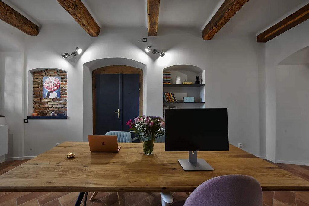Jedná se o kompletně zrekonstruovaný prostor o velikosti 30 m² s kuchyňským koutem, sdílenou toaletou a samostatným vstupem přímo z Husova náměstí v historickém domě ze 17. století.