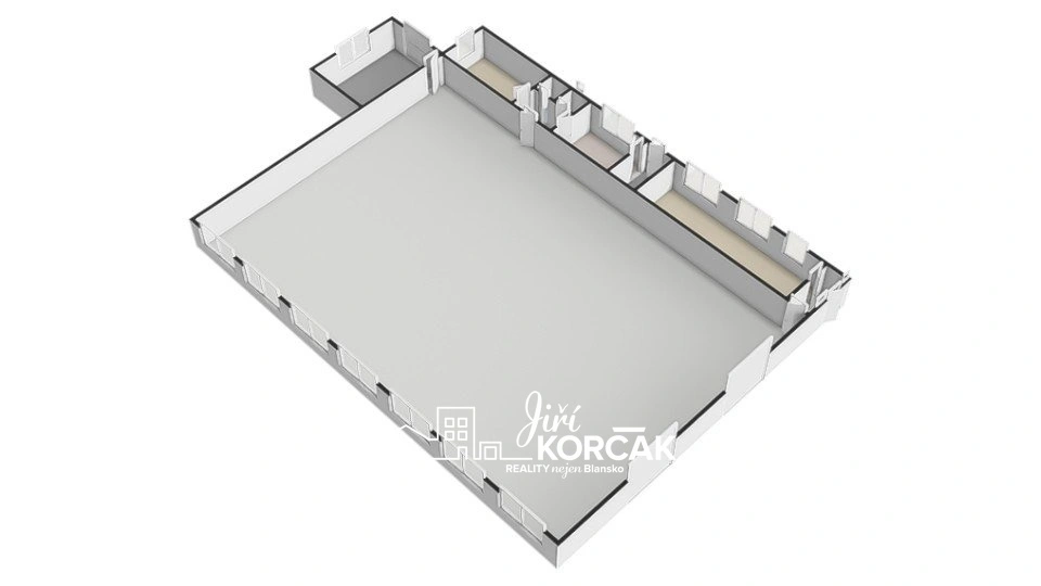 Hlavní hala má výměru 308 m² s rozměry cca 21,5 × 14,5 m, což poskytuje dostatek prostoru pro výrobu, skladování nebo lehký průmysl.