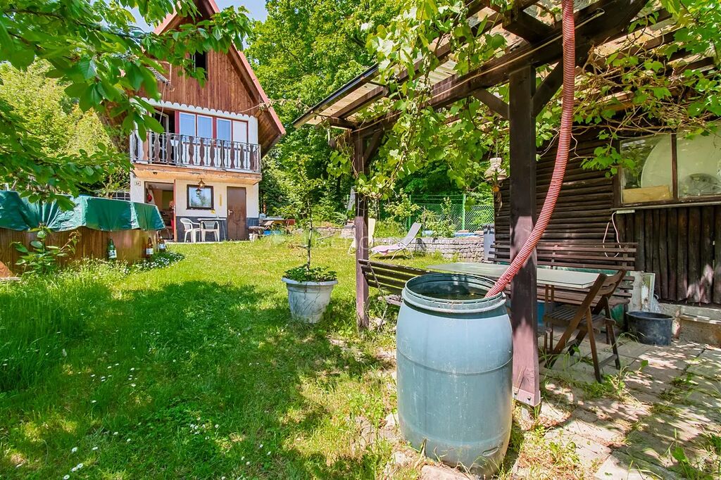 Výměra chaty 16 m2, zahrada = 386 m2 s ovocnými stromy (meruňka, 6x jabloně, 2x třešeň, 1x ryngle), septik s menším trativodem, udírna plechová, střecha pozink.