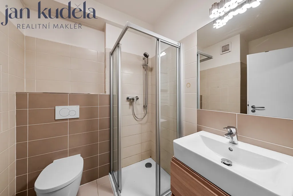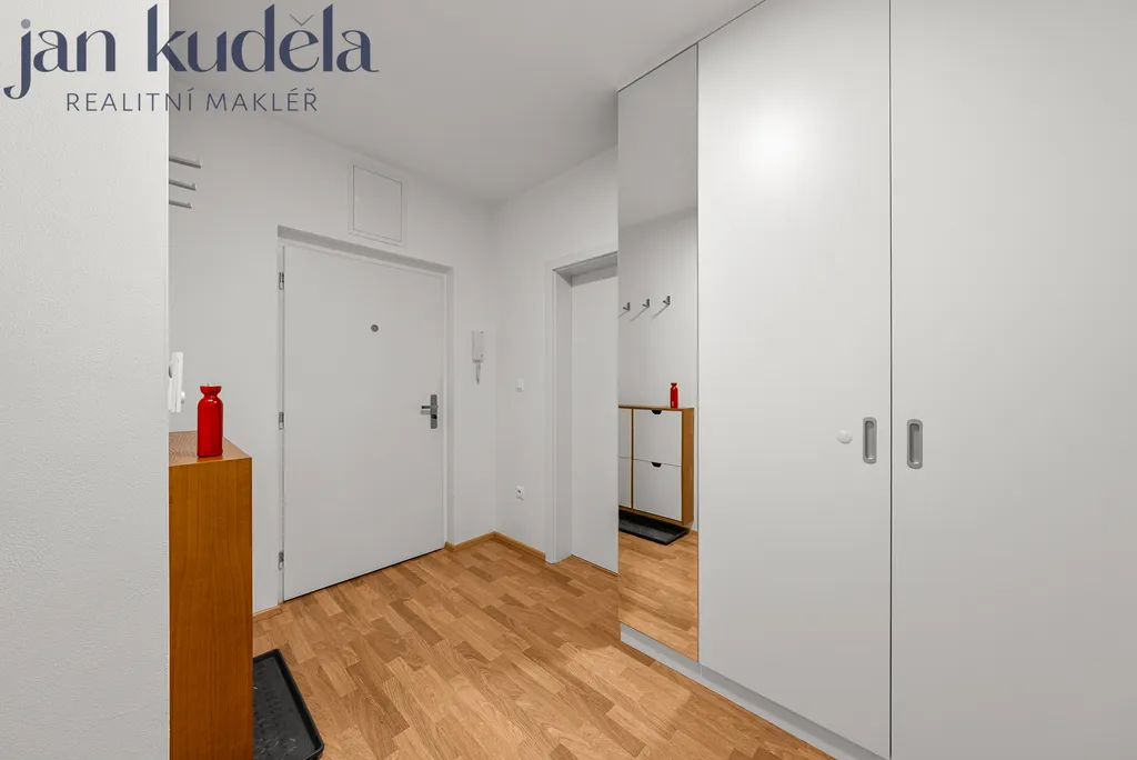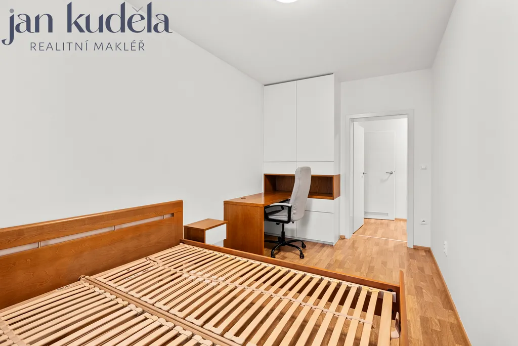 Při vstupu se nacházíte v prostorné chodbě, ze které je vstup do samostatné šatny vybavené úložným systémem. Z chodby dále vstupujete do ložnice, kde je postel, vestavěná skříň a pracovní stůl. Koupelna disponuje sprchovým koutem, toaletou a pračkou.