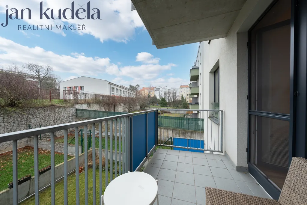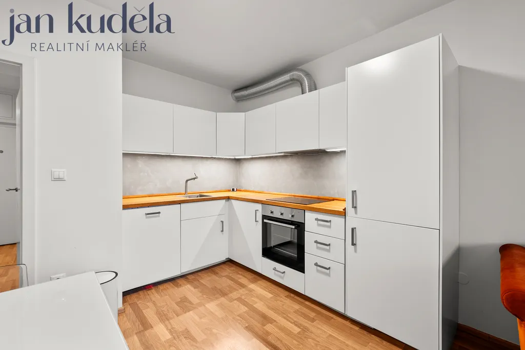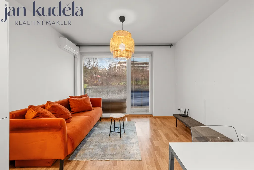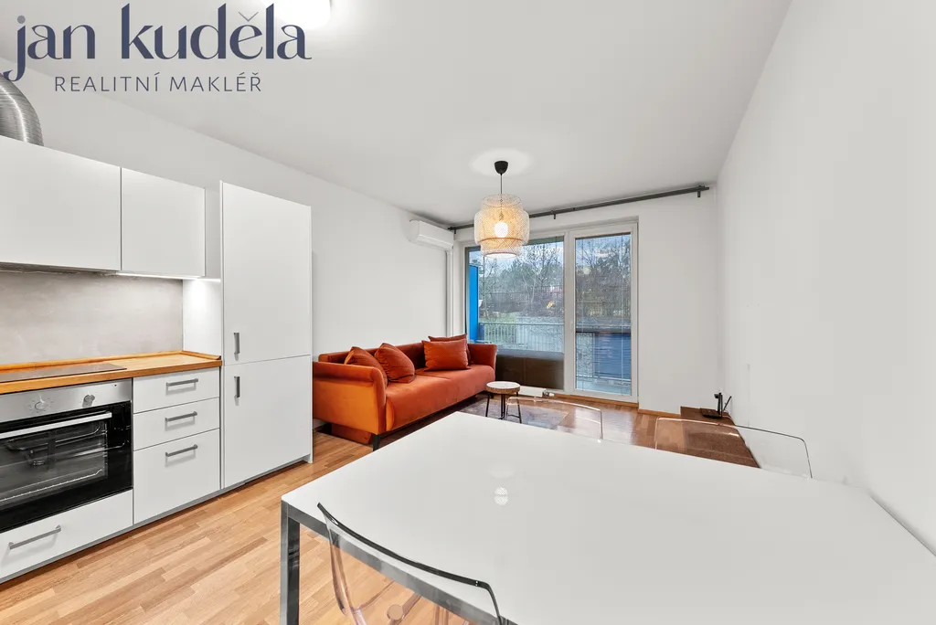 Obývací pokoj je propojen s kuchyňským koutem a nabízí přímý vstup na balkon orientovaný do zeleného vnitrobloku. Kuchyňská linka je vybavena vestavěnou lednicí, myčkou, indukční varnou deskou a troubou. Součástí obývací části je také rozkládací sedačka s úložným prostorem. Veškeré vybavení viditelné na fotografiích zůstává v bytě.