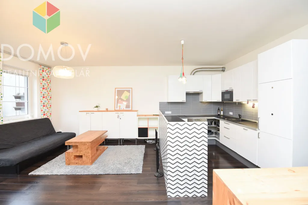 Moderně vybavená kuchyň s kuchyňskou linkou a spotřebiči volně navazuje na obývací pokoj, ze kterého je přístup na prostorný balkon. Dále se v bytě nacházejí dva samostatné pokoje.