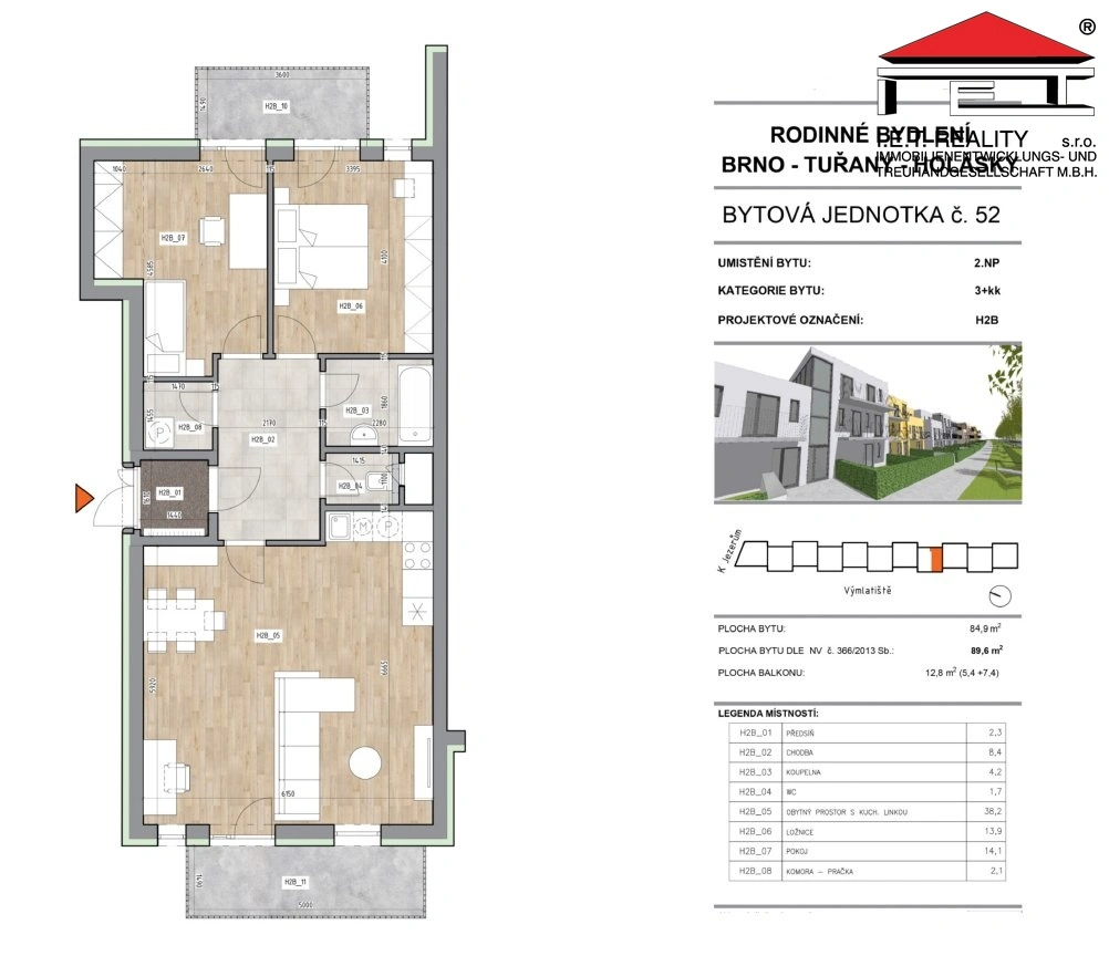 Prodej novostavby vilabytu č. 52, 3+kk, 89,6 m², se dvěma balkony 7,4 m² a 5,4 m², na něž je vstup možný ze všech pokojů. Jednotka je situovananá ve 2.NP čtyřpodlažního domu a její součástí je také sklep 5,6 m2.