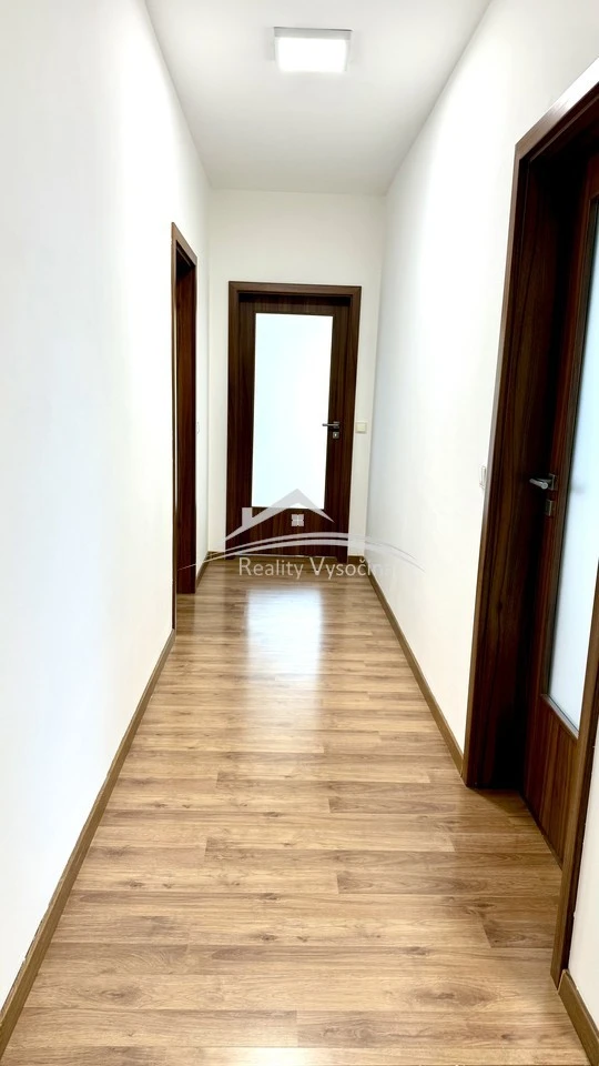 Dispozice bytu zahrnuje prostornou předsíň a chodbu, koupelnu s vanou, umyvadlem a místem pro pračku se sušičkou. Samostatné WC je umístěno hned vedle koupelny. Dominantou bytu je velkorysý obývací pokoj s kuchyní o ploše přibližně 45 m², orientovaný na jižní stranu směrem do ulice. Z této místnosti je přímý vstup na lodžii. Kuchyňská linka je plně vybavena vestavěnými spotřebiči – elektrickou varnou deskou, horkovzdušnou troubou, digestoří, myčkou a novou lednicí s mrazákem. Celý byt byl nově vymalován bílou barvou.