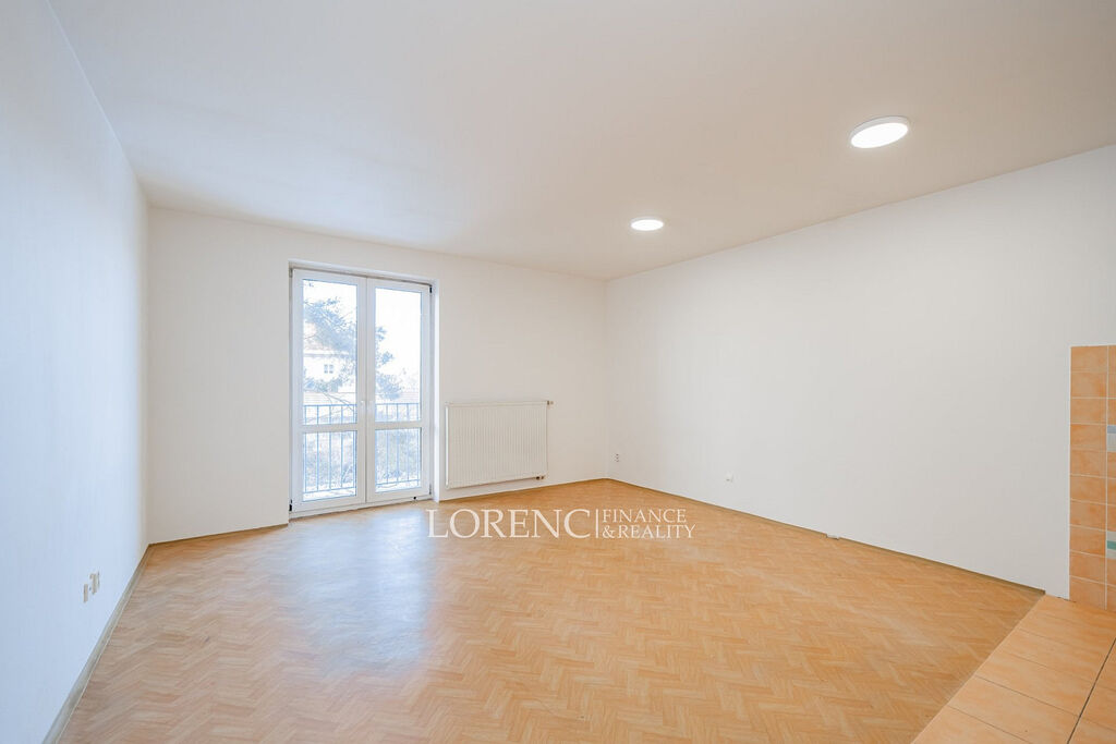 • Vlevo je obývací pokoj s kuchyňským koutem (26 m²), odkud je vstup na západně orientovaný balkon (2 m²) s výhledem do zeleně školkové zahrady – ideální místo na odpolední kávu.