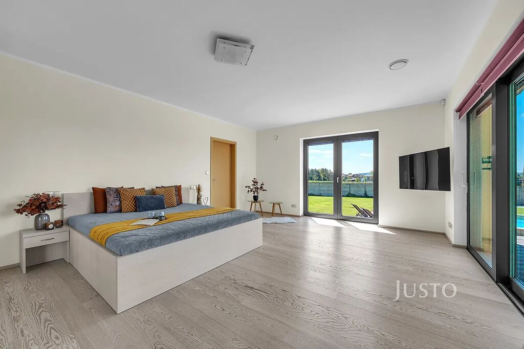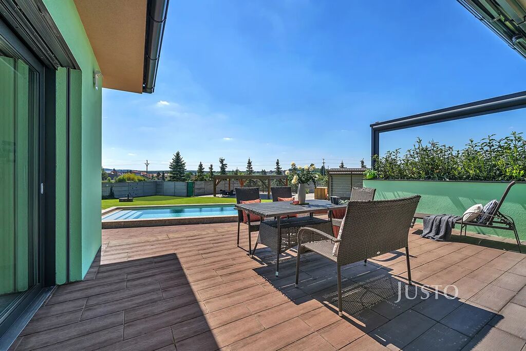 Dominantou vily je bezbariérový vstup na moderní terasu o ploše 32 m², kde si můžete užívat ranní kávu, rodinné snídaně, grilování i večerní posezení pod hvězdami. Děti zcela jistě ocení velkou zahradu o rozloze 3 135 m², která poskytuje nekonečný prostor pro hry, míčové sporty, stavění domečků nebo pikniky v trávě. V horkých dnech se zrelaxujte ve venkovním bazénu (47 m²) a užijte si soukromí za vzrostlými keři a plotem.