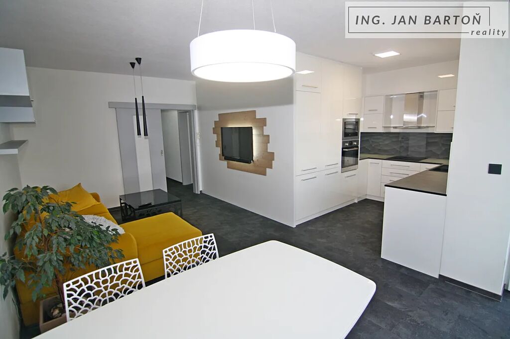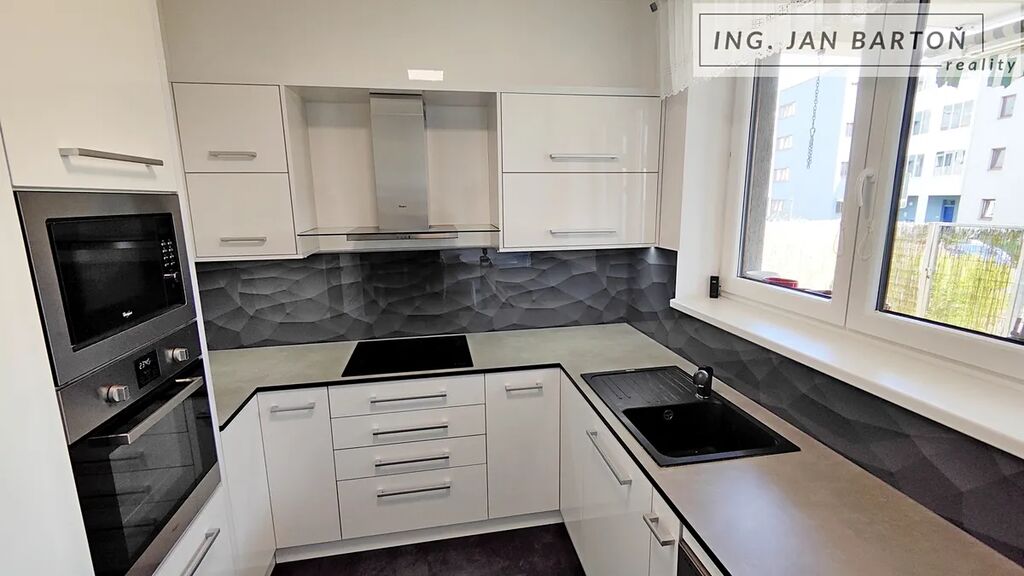 Byt je kompletně vybaven vkusným nábytkem i spotřebiči. V kuchyňské lince vestavěny všechny spotřebiče - lednice s mrazákem, myčka, trouba, mikrovlnka, varná deska i vinotéka.