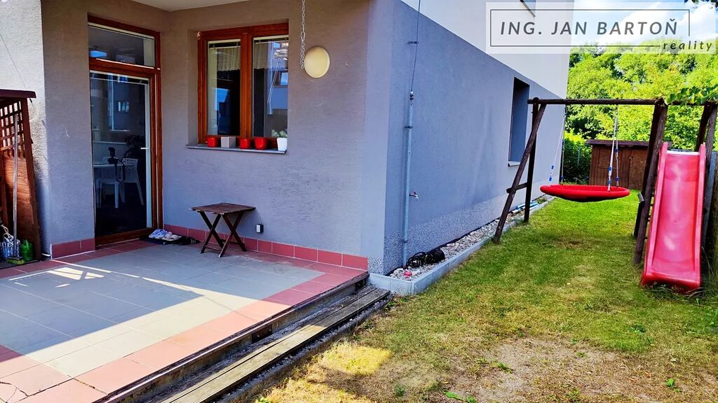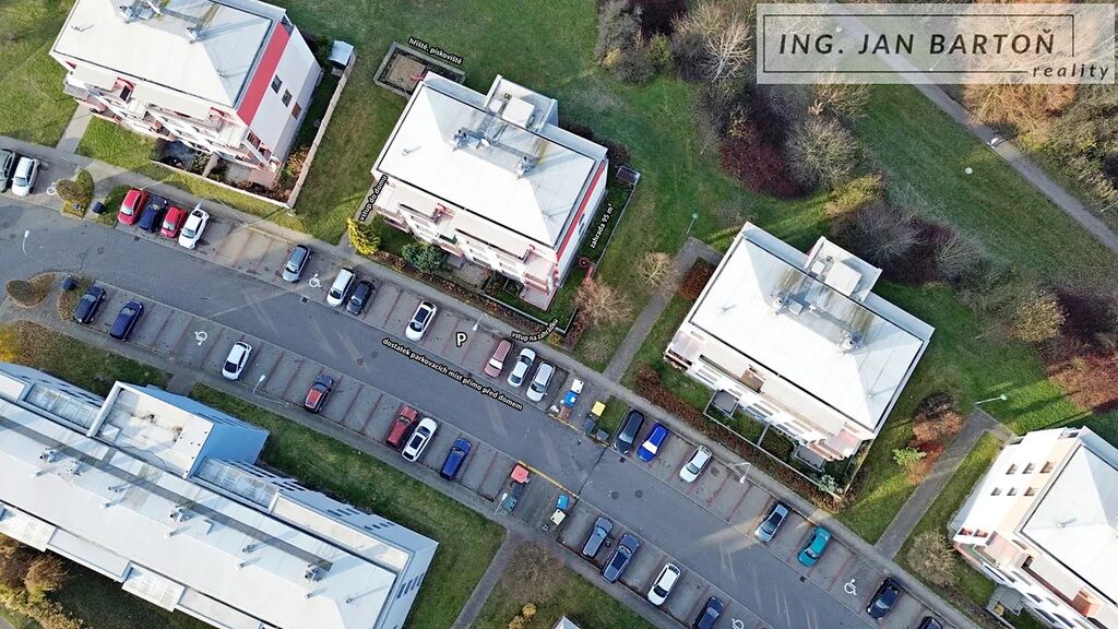 Parkovat lze přímo před bytem a brankou vstoupit z parkoviště rovnou na zahrádku a do bytu. Kolem domu spousta zeleně, rybník, dětské hřiště za domem.