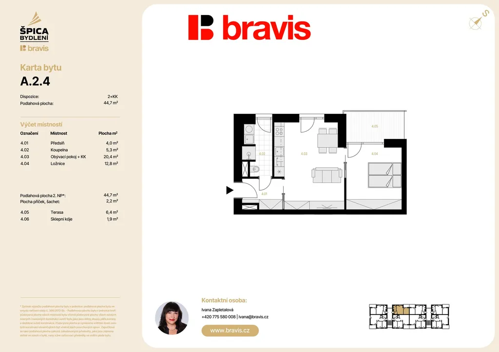 Nabízíme exkluzivní bytovou jednotku 2+kk (bytová jednotka A2-4) v novém projektu Špica bydlení — byt umístěný ve 2. NP nízkoenergetického bytového domu A. Celková podlahová plocha činí 44,7 m², navíc k ní náleží terasa 6,4 m², sklep a vlastní parkovací stání, což zajišťuje maximální komfort bez nutnosti dalších investic.