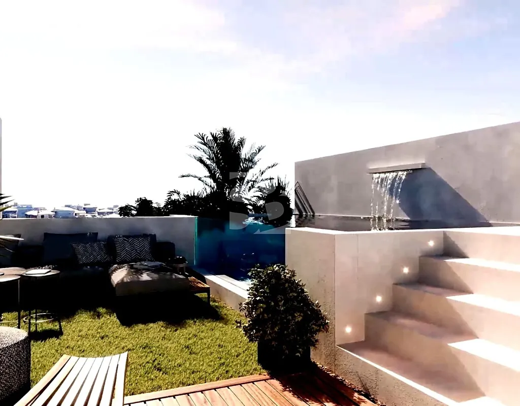 Obyvatelé mohou využívat společnou střešní terasu s vyhřívaným skleněným bazénem, ideální pro odpočinek po celý rok.