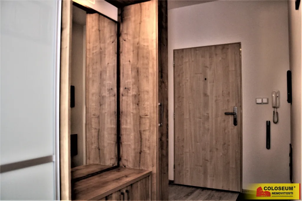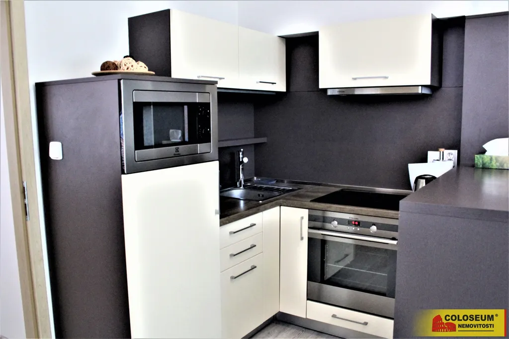 Dispozici tvoří pokoj s kuchyňským koutem o velikosti 15,3 m², chodba s předsíňovou stěnou a prostornou vestavěnou skříní o velikosti 9,2 m² a koupelna s toaletou o výměře 3,9 m². K bytu náleží také sklepní kóje o velikosti 1,8 m² a vyhrazené parkovací stání přímo vedle domu, na které je výhled z okna pokoje. Podlahy tvoří plovoucí laminát, v koupelně je položena dlažba. Kuchyňská linka je vybavena elektrickým sporákem s troubou, mikrovlnnou troubou, lednicí s mrazákem, varnou konvicí a základním kuchyňským nádobím. V koupelně je umístěna nová pračka. Dům je napojen na centrální vytápění; průkaz energetické náročnosti nebyl dodán, proto je uvedena třída G.