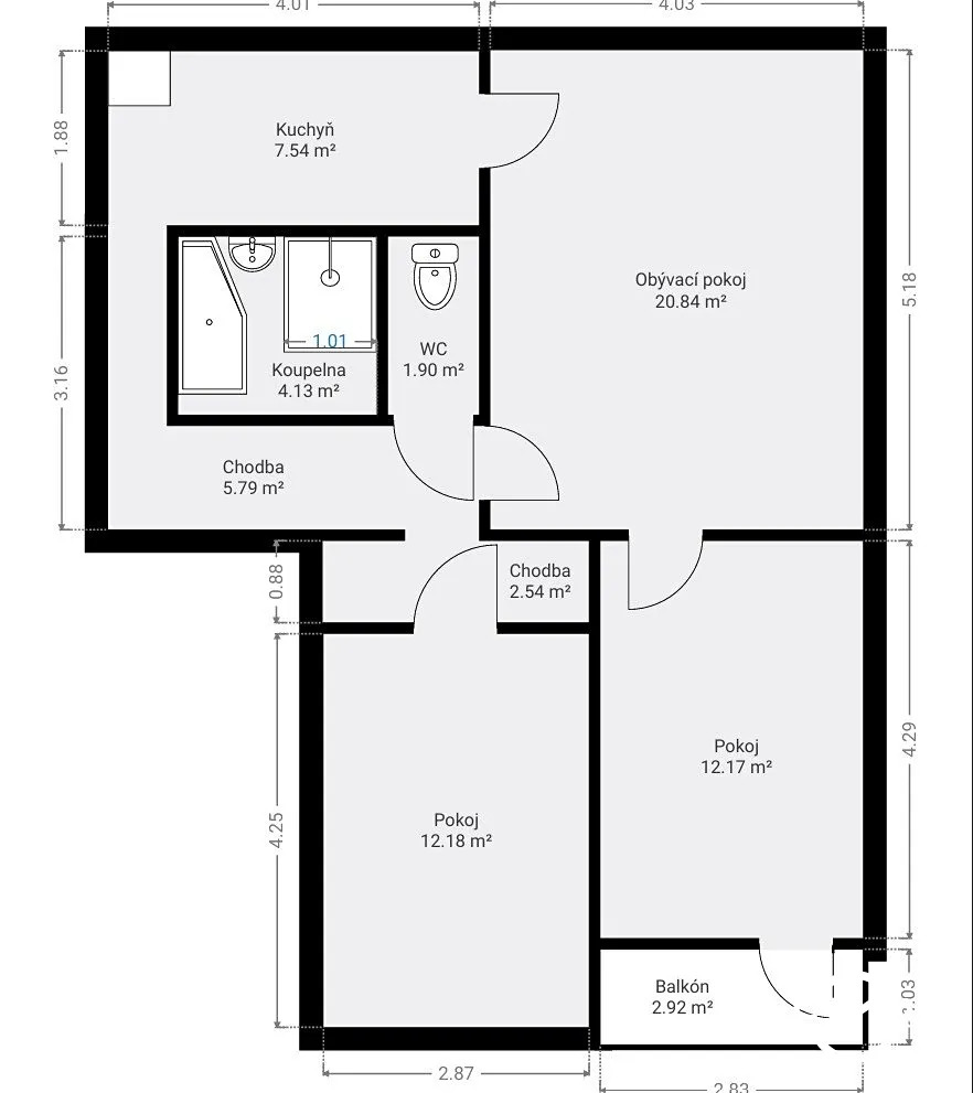 Vytápění - plynová kotelna ve sklepě a ohřev el. vody bojlerem v bytě je v koupelně.