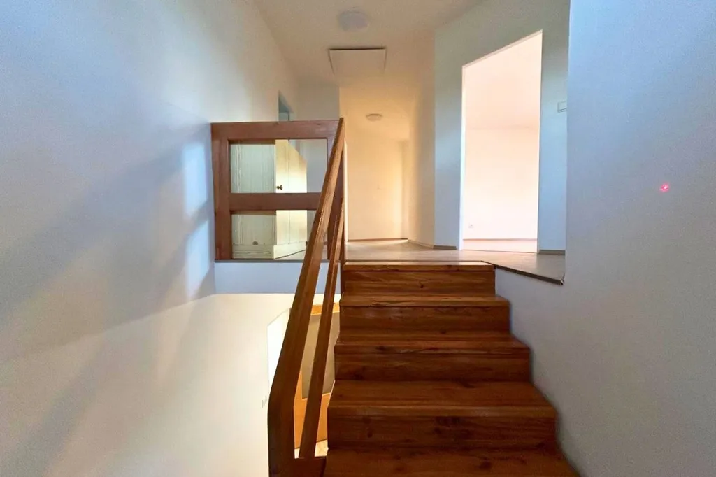 Dům je dvoupodlažní a jeho dispozice nabízí dostatek prostoru pro pohodlné rodinné bydlení. V přízemí se nachází prostorný obývací pokoj s krbem a francouzskými okny, které vedou na jižně orientovanou terasu, jež poskytuje krásné světlo a příjemný výhled. Kuchyně je plně vybavená veškerými spotřebiči – indukční varnou deskou, troubou, myčkou i velkou lednicí s mrazákem. V domě jsou celkem dvě koupelny, z nichž jedna je vybavena vanou a druhá sprchovým koutem. V patře se nachází tři ložnice. K dispozici je také velká šatna a jedna z ložnic má vlastní balkon. Dům je částečně zařízený a je ve výborném technickém stavu.