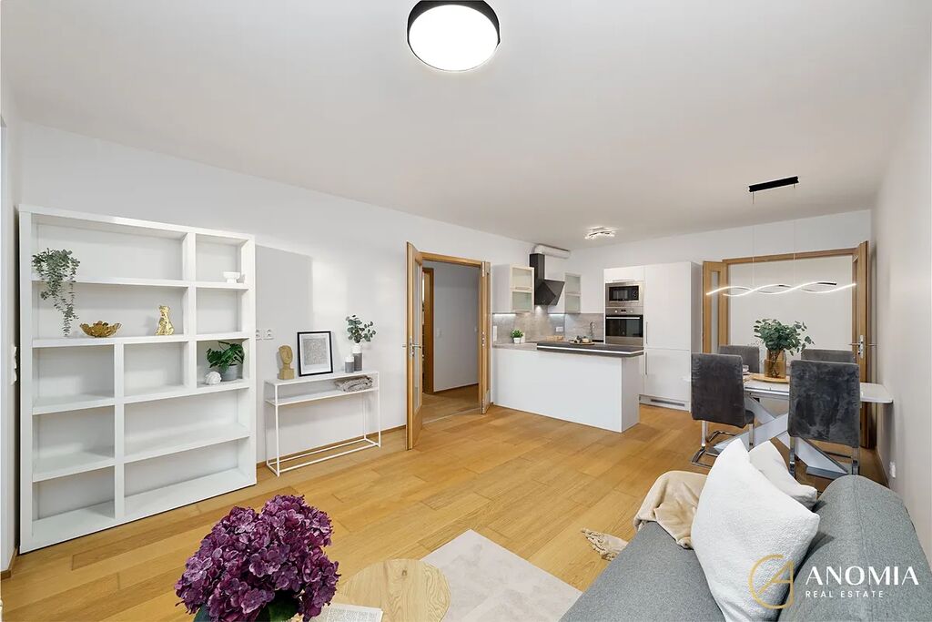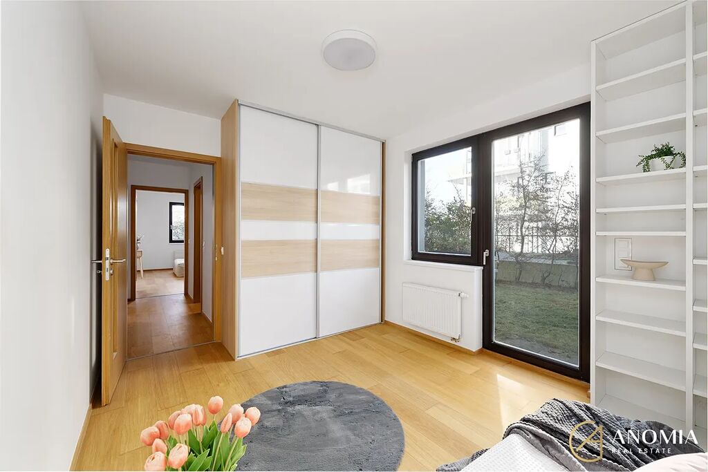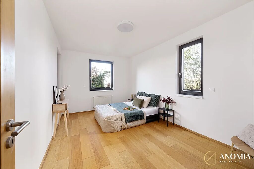 Srdcem celého bytu je prostorný obývací pokoj propojený s jídelnou a moderní kuchyní s barovým ostrůvkem, která je vybavená všemi potřebnými spořebiči. Díky velkým oknům sem proudí dostatek denního světla a celý prostor působí otevřeně a příjemně. Z obývací části i z ložnice je přímý vstup na soukromou zahrádku, která je pečlivě udržovaná a poskytuje klidné venkovní zázemí pro relax i rodinné chvíle. V létě oceníte také zastřešenou terasu, která prodlužuje možnosti využití venkovního prostoru od jara až do podzimu. K bytu náleží sklepní kóje. Bezproblémové parkování je možné v okolí domu.