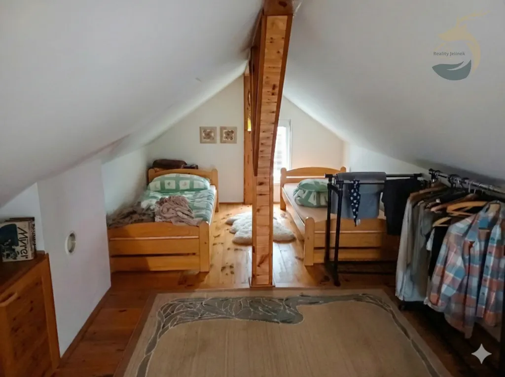 Vstoupíte do předsíně, odkud se otevře obývací prostor propojený s kuchyní, kde dominuje krb, který dokáže během chvilky vytvořit teplo nejen v místnosti, ale i v duši. V podkroví se nachází velký pokoj – ideální pro spaní, děti, hosty nebo jako romantické zázemí pod střechou.