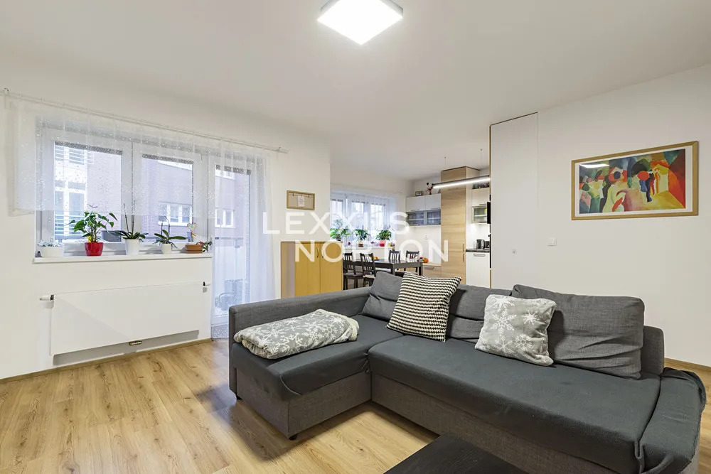Byt je vybaven kvalitními materiály a praktickými prvky pro pohodlné bydlení. Součástí bytu je kuchyň na míru, která je funkční a esteticky řešená. V celém bytě jsou položeny vinylové podlahy, které jsou moderní, odolné a snadno udržovatelné. V domě se nachází výtah, který zajišťuje komfort při každodenním pohybu. Sklep o velikosti 3,4 m² poskytuje dodatečný úložný prostor a velké parkovací stání (vhodné i pro invalidy) je vyhrazené a snadno dostupné. Byt je připraven k okamžitému nastěhování a nabízí vše potřebné pro moderní a pohodlný život.
