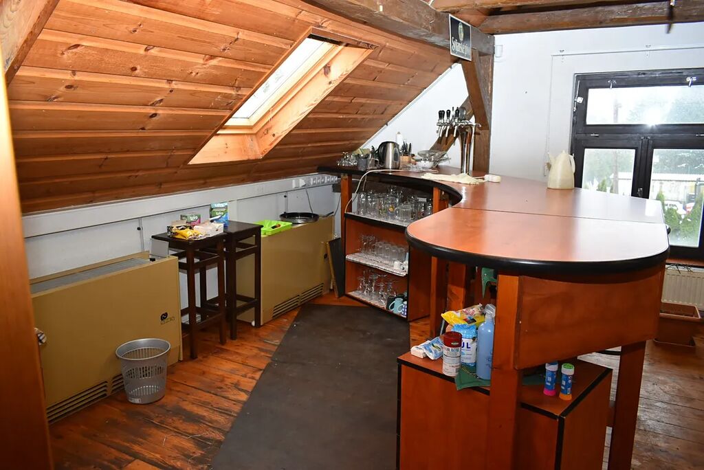 V patře se nachází stylová místnost s barem a kuchynkou. Zde se dají točit různé nápoje a připravovat různé dobroty. Je zde i mistnost pro ruzné hry a WC dámské a pánské. Součástí je i galerie s pěkným výhledem na oslavence.