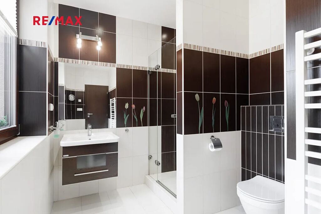 Při stoupání do prvního patra se nám nabídne prostorná chodba se vstupy do 3 ložnic, z nichž jedna z nich lze rozdělit na dva samostatné pokoje. Součástí každé ložnice je šatna s úložným prostorem. V prvním patře najdeme další koupelnu, tentokrát s vanou i se sprchovým koutem, dále pak samostatné WC.