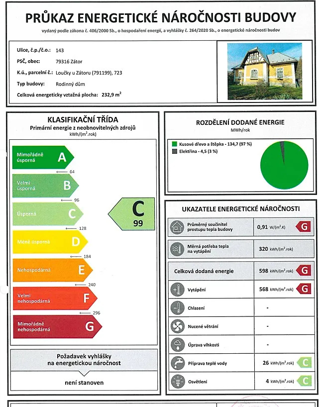 Dispozice objektu: kuchyně, 3 ks pokoje, předsíň, koupelna, WC.