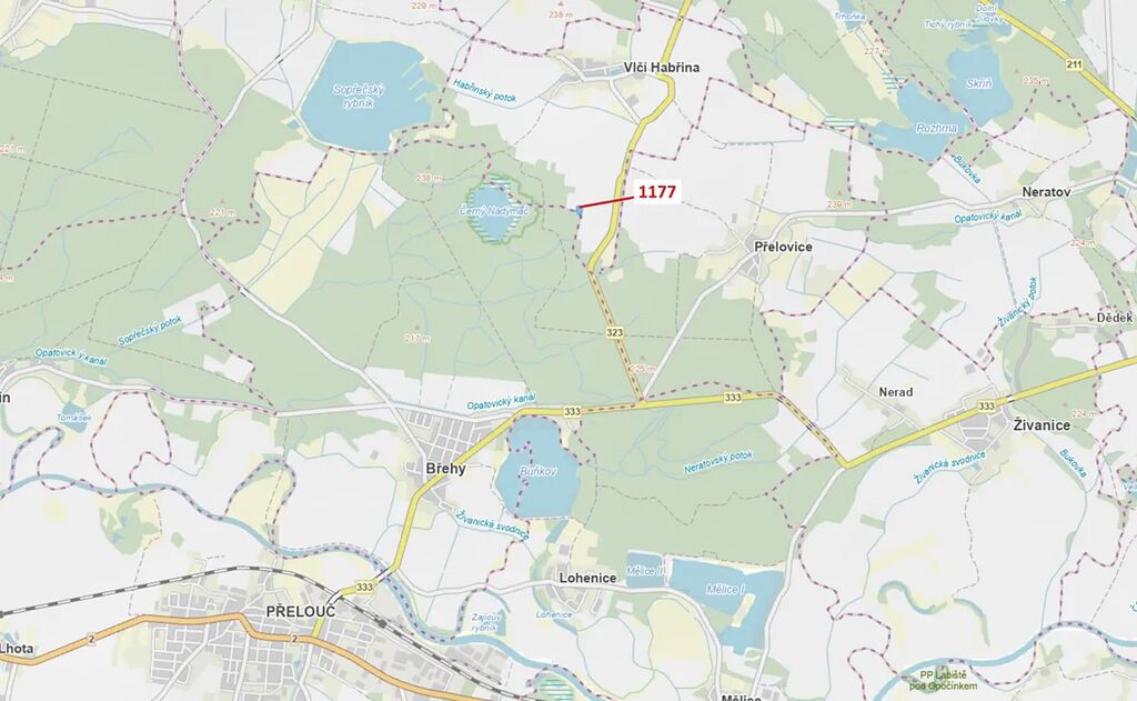 Lesní pozemek o výměře 4658 m2, parcelní číslo 1177, podíl 1/1, katastrální území Vlčí Habřina, obec Vlčí Habřina, obec s rozšířenou působností Pardubice, okres Pardubice, Pardubický kraj. Po těžbě.
