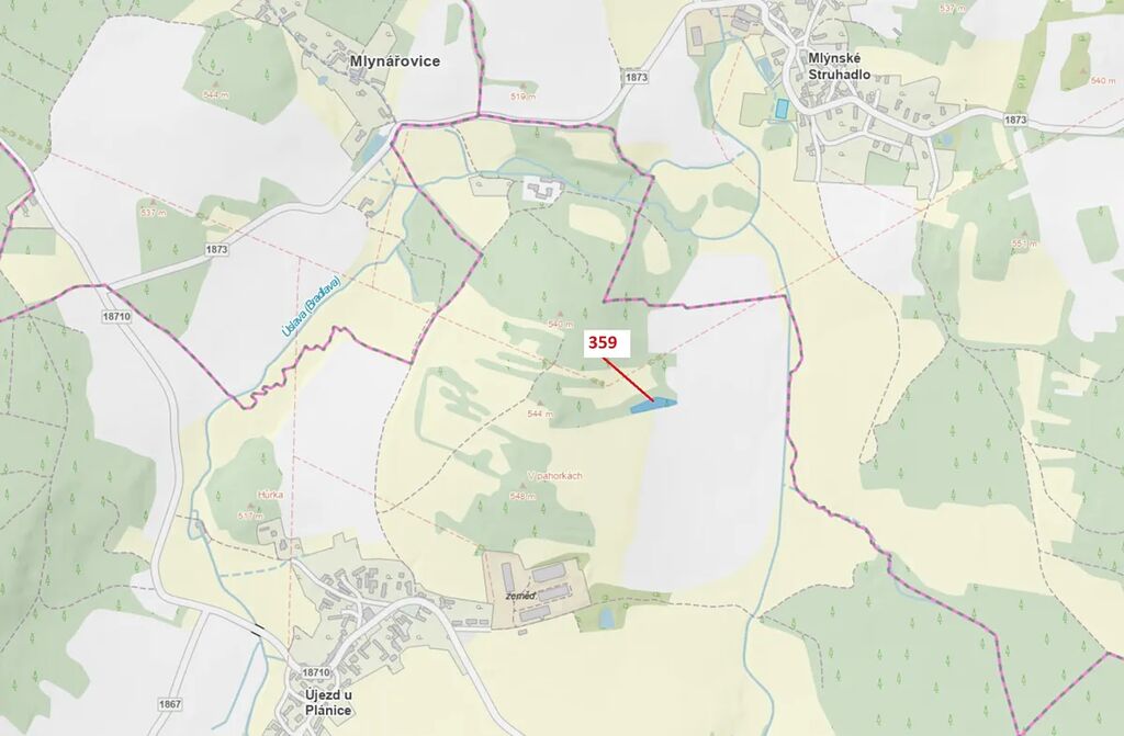 Lesní pozemek o výměře 1743 m2, parcelní číslo 359, podíl 1/1, katastrální území Újezd u Plánice, obec Újezd u Plánice, obec s rozšířenou působností Klatovy, okres Klatovy, Plzeňský kraj.